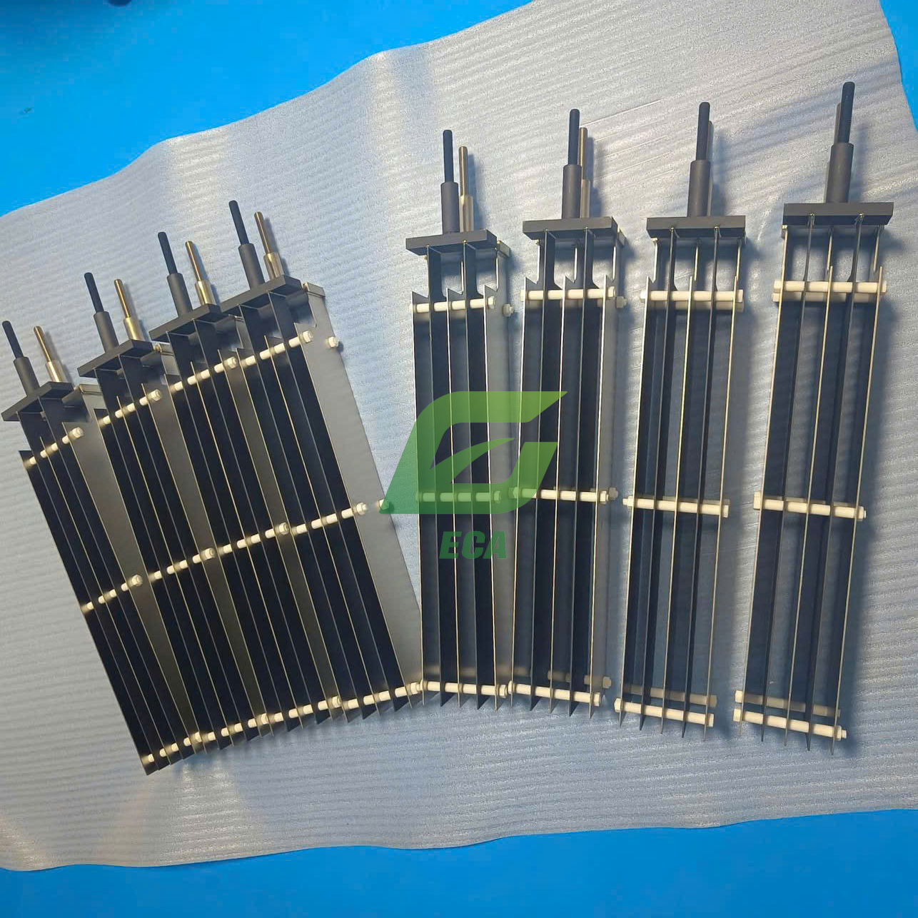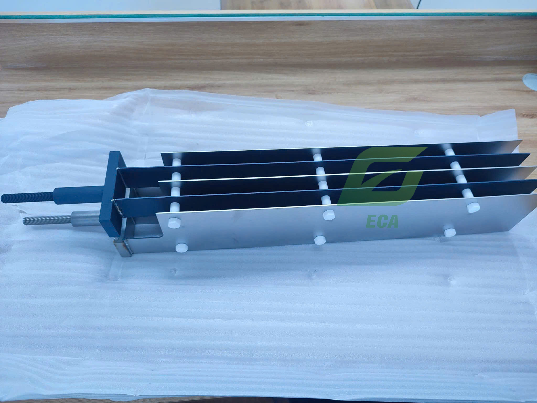 Thông số kỹ thuật của Thanh điện cực titan Cực dương (Số lượng: 2 tấm)Quy cách: 2x120x640mm Titan phủ Ruthenium + Irdium Cực âm (Số lượng: 3 tấm)Quy cách: 2x120x640mm Titan Thanh dẫn điện Titan hoặc Đồng bọc titan Bu lông và long đền bắt dây điện Titan+ Inox